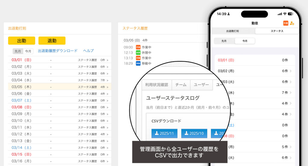 - 管理者による一括ダウンロード:管理画面から全ユーザーの履歴をCSVで出力できます。チームの稼働状況の分析や、労務管理の補助として活用いただけます。